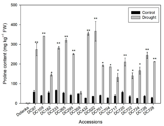 Proline content in the leaves of 18 analyzed carrot accessions grown under control and drought conditions. The amino acid concentration was measured in leaves of 150-day-old plants. Asterisks indicate significant differences between control and drought treatments (* p ≤ 0.05; ** p ≤ 0.01).