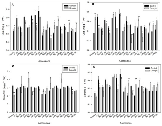Content of chloroplastic pigments in the leaves of 18 carrot genotypes cultivated under control and stress conditions. (A) chlorophyll a (Chl a); (B) chlorophyll b (Chl b); (C) ratio of chlorophyll a and chlorophyll b (Chl a:Chl b), and (D) carotenoids (Car). Measurements were performed on 150-day-old plants. Statistically significant differences in stressed plants compared to controls are * p ≤ 0.1 and ** p ≤ 0.05.