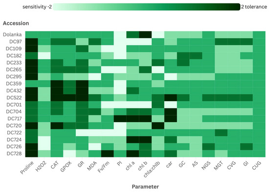 Summary of drought tolerance in carrot genotypes. Heatmap visualization of drought tolerance parameters across carrot accessions. Median values for each measured parameter are displayed using a color gradient from green (high drought tolerance) to white (low drought tolerance), facilitating the identification and selection of drought-tolerant cultivars. For further details, see the Discussion Section.