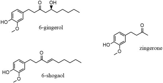 The rhizome is the part of the Zingiber officinale plant that is used, both fresh and as dry powder. The chemical composition of the ginger rhizome has been thoroughly studied, with more than 60 active constituents identified. Compounds found in ginger are organized into two main categories: volatile and non-volatile []. The non-volatile compounds of ginger include gingerols, shogaols, paradols and zingerone, and they are the representative bioactive constituents of ginger, making up 1–6% of fresh ginger by weight. The pungent flavors and odors of these non-volatile compounds give the distinctive scent and taste to ginger []. The gingerols are differentiated by the length of their unbranched alkyl chains, present as 6-, 8- and 10-gingerol. Of these, 6-gingerol is the most abundant (about 6% w/w), although it is thermally unstable because of its β-hydroxy keto group []. When heat is applied, gingerol degrades to the corresponding shogaol through a dehydration process. Through a retro aldol reaction, the alkyl chain is cleaved and results in the formation of zingerone, (4-(4-hydroxy-3-methoxyphenyl)butan-2-one) and C11H14O3 (Figure 1) []. As a result, zingerone concentration in dried ginger is present in a greater amount. Recent gas chromatography/mass spectroscopy analysis of ginger demonstrated that zingerone was one of the pungent compounds [].