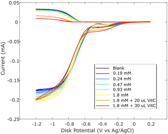 RRDE voltammograms after additions of 0.03 M zingerone and 0.03 M vitamin C. Blank plus first five aliquots are the concentrations of zingerone used. To the 1.8 mM zingerone solution, 20 μL of 0.03 M vitamin C was added (0.012 mM) (orange); the last experiment (red) has 50 μL total vitamin C added (0.03 mM).