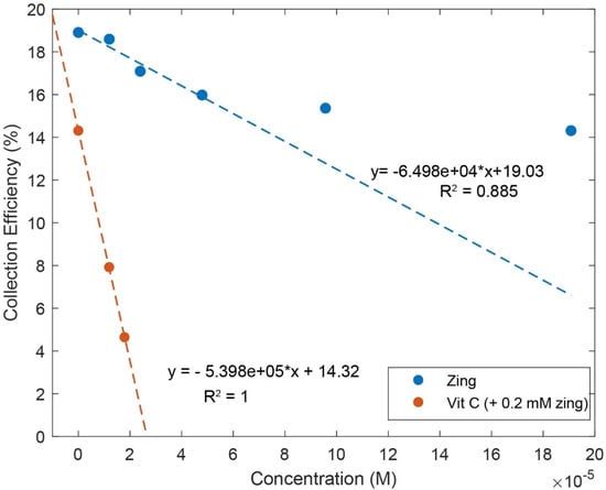 Collection efficiencies for solutions containing zingerone (“zing”) only (blue line) and solutions containing both zingerone and vitamin C (red line). For comparison, the slope of pure vitamin C is −2.6 × 104 M−1 []. The steeper slope for the red line shows that the greater the rate of change, the more effective the antioxidant activity. For zingerone line expression, only the first four points were included.