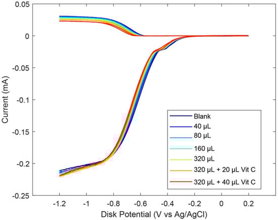 RRDE voltammograms after additions of 20.7 mg/mL ginger powder and 0.03 M vitamin C. Blank plus first five aliquots are volume of ginger used. To the 320 μL ginger solution, 20 μL of 0.03 M vitamin C was added (0.012 mM) (orange); the last experiment (red) has 50 μL total vitamin C added (0.03 mM).