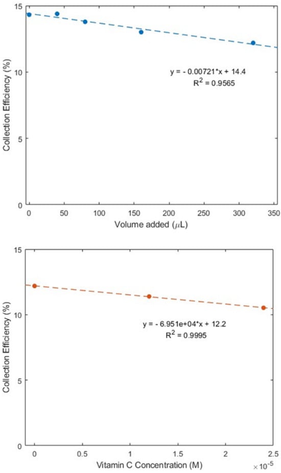 Collection efficiencies for (top) solutions of varying ginger volume added and (bottom) 320 μL of ginger (0.13 mg/mL) solution with added vitamin C.