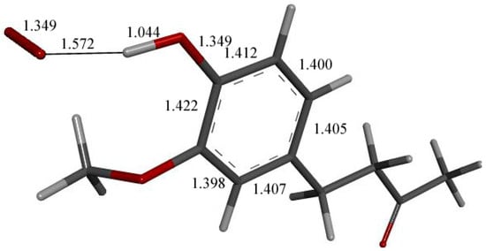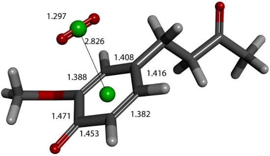 Further exploration of the proton action in the previous Figure 12 arrangement was also made after elimination of H2O2, and zingerone semiquinone has superoxide π-π van der Waals placed above the ring, with separation between their centroids of 3.50 Å. This is markedly shortened upon DFT optimization, 2.826 Å (Figure 16). Comparison with Figure 9 shows elongation of bond lengths C3-C4 (1.471 Å) and C4-C5 (1.453 Å), compared to 1.414 Å and 1.392 Å, respectively. In addition, the C2-C3 (1.388 Å) and C5-C6 (1.382 Å) bond lengths become shorter than in Figure 9, 1.394 Å and 1.404 Å, respectively. This is consistent with a para-quinone-like arrangement for a conjugated single/double C-C bond configuration.