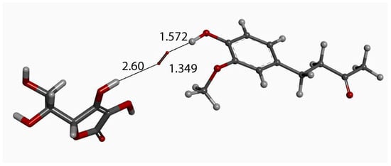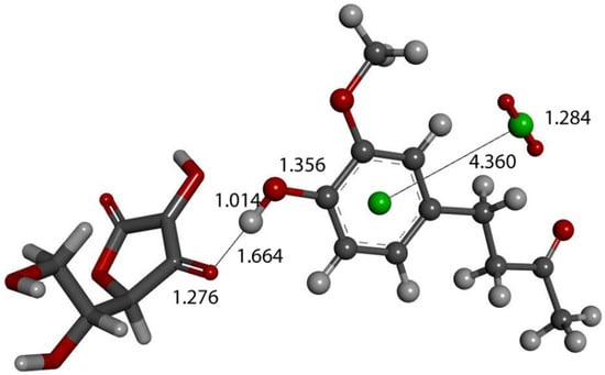 We input the X-ray coordinates of zingerone in our Dmol3 system to obtain the resulting minimum of energy structure (Figure 9), and it is very similar to that in the crystal. The main difference is due to the different environment of the hydroxy group, which includes the neighboring keto group from another molecule in the crystal through the H-bond; see Section 2.1. This does not exist in the isolated molecule studied with DFT, and the hydroxyl group establishes an intramolecular H-bond to the methoxy group—D(H-O) = 2.121 Å. Our first approach to studying the interaction between the superoxide radical anion and zingerone began with the van der Waals separation between superoxide and the hydroxyl group of zingerone (Figure 10). The resulting product of DFT optimization shows a H-bond between both groups, as seen in Figure 11, and so, at this stage, there is no extraction of the proton by superoxide. Our next calculation explored the action of an acidic proton, resulting in the formation of a molecule of H2O2, separated by 1.819 Å (Figure 12). An equivalent study was performed using ascorbic acid to replace the isolated proton, with the initial arrangement shown in Figure 13. DFT optimization of this structural complex resulted in the superoxide radical capturing the acidic proton, along with the formation of ascorbate separated by 1.708 Å from the HO2 group, but the hydroxyl group of zingerone was not abstracted (Figure 14).