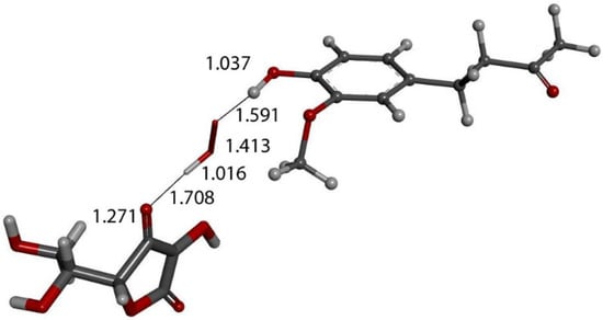 Overall, our experimental results show that zingerone is a stronger antioxidant than ginger powder and that there is an apparent synergistic effect between the zingerone and vitamin C. In fact, our DFT-derived mechanism reveals that ascorbic acid provides the necessary protons for zingerone scavenging action, as shown in Section 2.3.