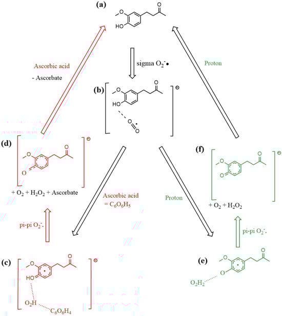 Mechanism of zingerone antioxidant action for scavenging the superoxide radical. (a) zingerone; (b) σ interaction between superoxide and zingerone hydroxyl in position 4 establishes a H-bond (1.591 Å in Figure 11); (c) red color: ascorbic acid releases its proton after interaction with the most exposed O atom of superoxide, forming the HO2 species which interacts through H-bond with H(4) of zingerone (1.591 Å) and ascorbate (1.708 Å), as seen in Figure 14, that is, zingerone still holds its 4-OH proton insensitive to this attack; (d) upon π-π interaction of a second superoxide, H2O2 forms, well separated from zingerone O(4), 1.941 Å, and ascorbate, 1.902 Å. Meanwhile a molecule of O2 is released, as seen in Figure 15. After elimination of O2 and H2O2 the remaining semiquinone zingerone molecule reacts with an additional ascorbic acid reforming zingerone (Figure 17). The alternative mechanism (green color) is shown in (e,f). (e) species shown in (b) interacts with a proton, resulting in H2O2 formation, well separated by a H-bond from the semiquinone zingerone derivative, 1.819 Å (Figure 12). (f) π-π interaction of a second superoxide establishes ring/superoxide interaction, centroid–centroid distance of 2.826 Å, as shown in Figure 16. The resulting semiquinone reacts with a second proton, yielding regenerated zingerone.