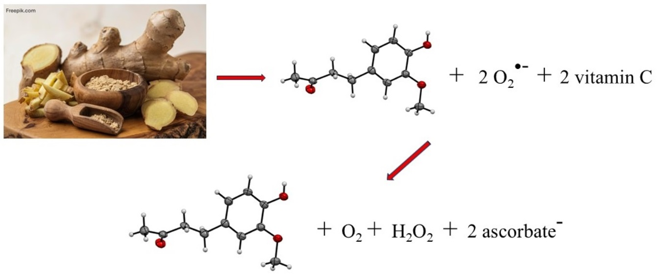 Rossi, M.; Teitsworth, T.S.; McKenzie, E.; Caruso, A.; Thieke, N.; Caruso, F. Ginger (Zingiber officinale) and Zingerone Antioxidant Properties Studied Using Hydrodynamic Voltammetry, Zingerone Crystal Structure and Density Functional Theory (DFT)—Results Support Zingerone Experimental Catalytic Behavior Similar to Superoxide Dismutases (SODs). Int. J. Mol. Sci. 2025, 26, 10645. https://doi.org/10.3390/ijms262110645