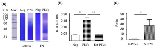 Biological activity in SKOV-3 PEVs induced with FN-SBMF E. coli. (A) Zymograms of gelatin or FN as substrate, where the total extract of SKOV-3 PEVs induced with SDS-SBMF was run. (Neg) control without load. (B) Absolute phosphatase activity at 2 h with 1.6 µM pNPP; PEVs were pre-activated with DTT. (Neg) control without sample, (PEVs) unlysed PEVs, (Ext-PEVs) PEV extract by sonication. (C) PEV secretion ratio taken as Ratio 1 to the secretion detected with EVAnalyzer in unstimulated cells. U-PEVs: unstimulated; S-PEVs: stimulated. n = 3 (B) and n = 6 (C) were used for one-way Anova with Bonferroni’s post hoc test, * p < 0.05, ** p < 0.01.