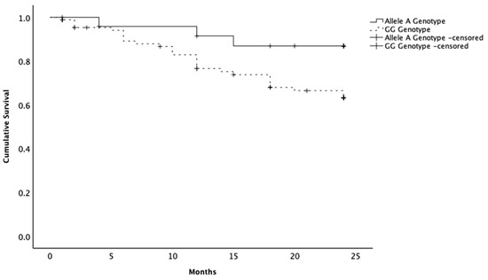 Kaplan–Meier curves of the survival times of female dogs with malignant mammary neoplasia. Animals presenting the allele A variant in the SNP rs397510595 of the PTEN gene showing a longer survival time compared to the female dogs with the wild-type genotype (GG). Censoring is indicated by the + symbol.