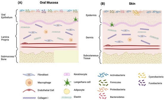 Comparative Features of Oral Mucosa (A) and Skin Relevant to Wound Healing (B). Comparison of oral mucosa and skin, highlighting key histological and cellular features relevant to wound healing. Both tissues share a stratified squamous epithelium and underlying connective tissue (lamina propria or dermis) composed of fibroblasts, immune cells, and extracellular matrix fibers. Created in BioRender. Chuhuaicura, P. (2025) https://BioRender.com/e3wbbfg (accessed on 29 October 2025).