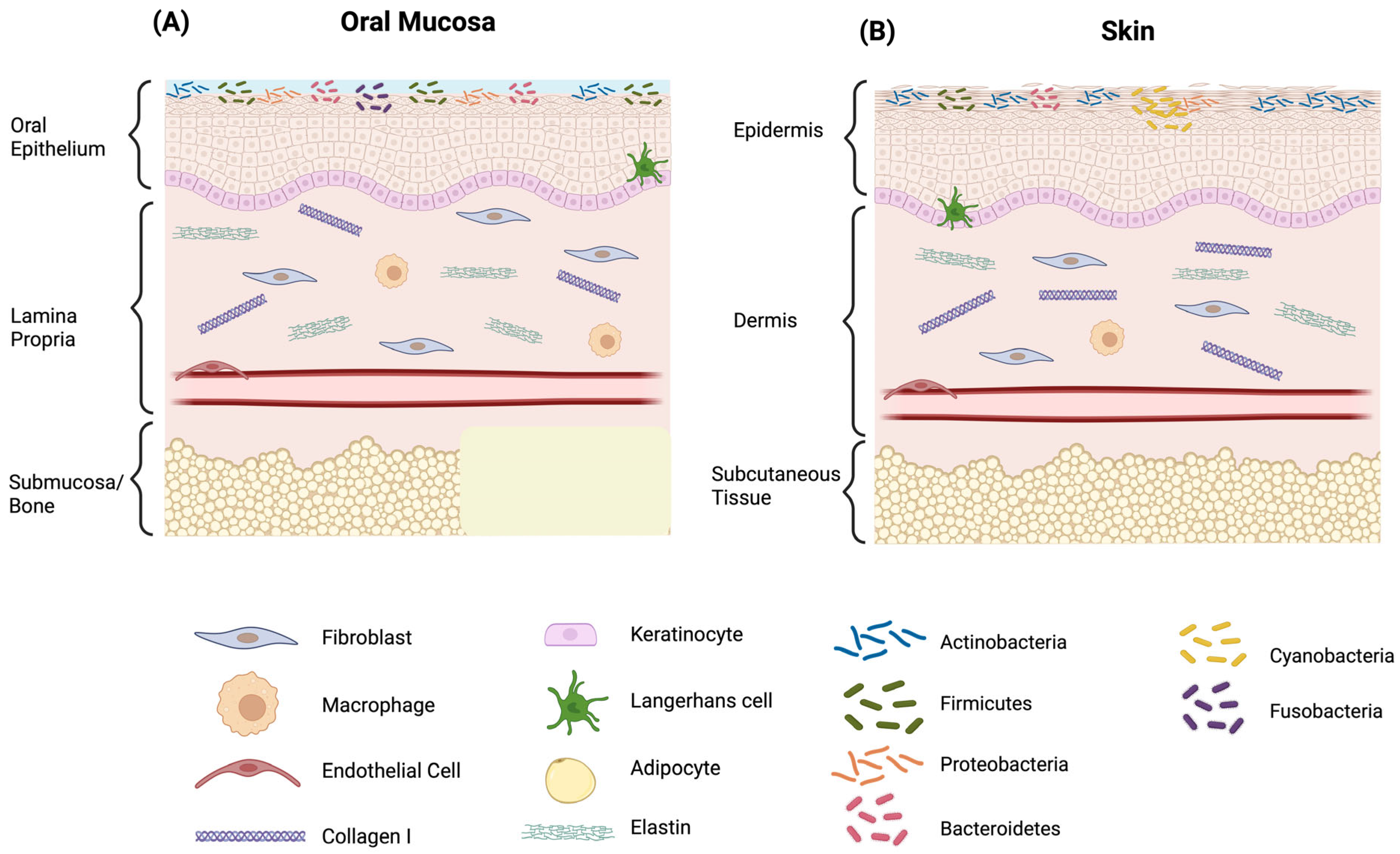 - Waasdorp, M.; Waasdorp, M.; Krom, B.P.; Bikker, F.J.; van Zuijlen, P.P.M.; Niessen, F.B.; Gibbs, S. The bigger picture: Why oral mucosa heals better than skin. Biomolecules 2021, 11, 1165. [Google Scholar] [CrossRef] [PubMed]