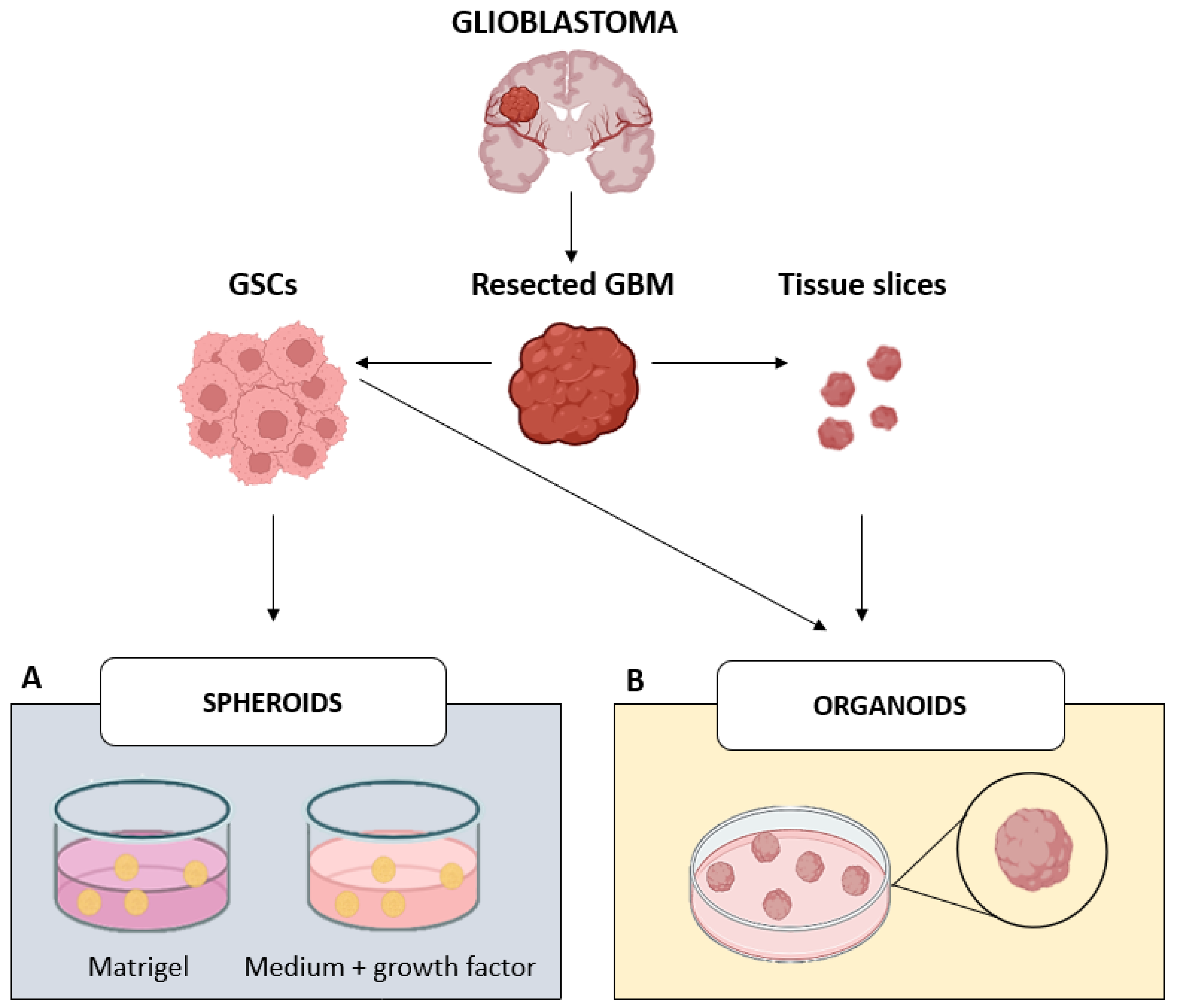 - Liang, J.; He, P. A reference for selecting an appropriate method for generating glioblastoma organoids from the application perspective. Discov. Oncol. 2024, 15, 459. [Google Scholar] [CrossRef]