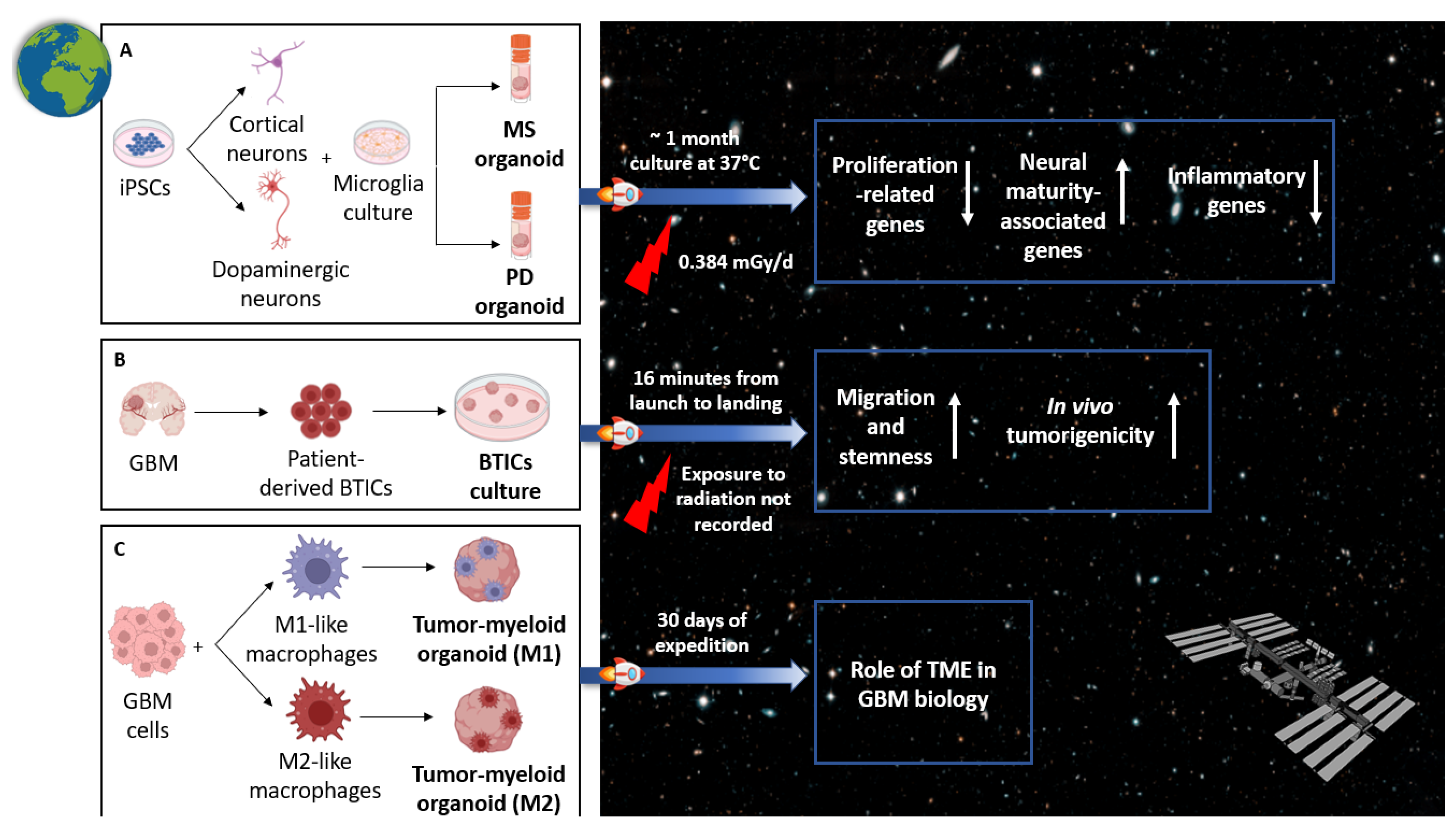 - Marotta, D.; Ijaz, L.; Barbar, L.; Nijsure, M.; Stein, J.; Pirjanian, N.; Kruglikov, I.; Clements, T.; Stoudemire, J.; Grisanti, P.; et al. Effects of microgravity on human iPSC-derived neural organoids on the International Space Station. Stem Cells Transl. Med. 2024, 13, 1186–1197. [Google Scholar] [CrossRef]