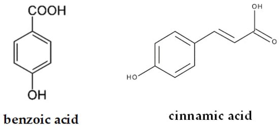 Phenolic acids found in food are non-flavonoid phenolic compounds, divided into benzoic acid derivatives and cinnamic acid derivatives [14]. Benzoic acid derivatives naturally occur in raw materials such as chokeberry, blackcurrant, radish, grapes, strawberries, raspberries, onions, coffee fruit, and tea leaves [15]. Cinnamic acid derivatives, on the other hand, naturally occur in raw materials such as apples, plums, pears, potatoes, cabbage, lettuce, spinach, red wine, and olive oil [16]. Figure 2 graphically presents the two subclass groups of phenolic acids.