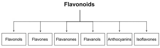 Due to their wide variety in structural composition, flavonoids are divided into six subclasses: flavonols, flavones, flavanones, flavanols, anthocyanins and isoflavones—Figure 4 [18,19,20].