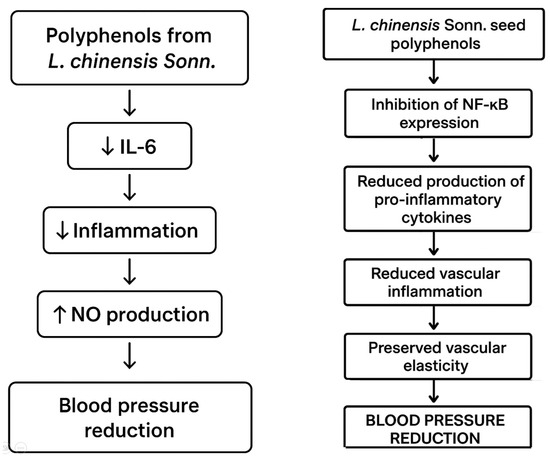 The calyxes of roselle and the leaves of lemon verbena have been shown to be rich in anthocyanins and phenylpropanoids, such as verbascoside (a phenylpropanoid glycoside) and isoverbascoside (a phenylethanoid glycoside), which have strong antihypertensive and anti-inflammatory properties. Among the antihypertensive compounds, large amounts of anthocyanins, such as delphinidin-3-O-sambubioside and cyanidin-3-O-sambubioside, have also been isolated. It has been observed that daily consumption of phenolic extract containing 500 mg of polyphenols (175 mg of polyphenols from Hibiscus sabdariffa flowers and 325 mg of polyphenols from Lippia trifoliata leaves) significantly reduces mean blood pressure, especially systolic blood pressure (SBP), by an average of 3.76 mm Hg. The observed synergistic effect in lowering systolic blood pressure is explained by the ability of the polyphenols contained in Hibiscus sabdariffa and Lippia citriodora (mainly catechins and epicatechins) to increase the activity of endothelial nitric oxide synthase (eNOS), resulting in increased vasodilation. In addition, polyphenols contained in Hibiscus sabdariffa and Lippia citriodora may inhibit the activity of angiotensin-converting enzyme I, thereby reducing the activity of angiotensin II. Furthermore, it has been suggested that polyphenols derived from Hibiscus sabdariffa and Lippia citriodora may increase the expression of the adiponectin and PPAR-α genes while simultaneously reducing the level of NF-kB (nuclear factor kappa B) protein. Adiponectin is a powerful anti-inflammatory factor that inhibits the activation of inflammatory pathways involving NF-kB and thus reduces the production of pro-inflammatory cytokines. In turn, PPAR-alpha (peroxisome proliferator-activated receptor alpha) is a protein transcription factor that negatively regulates pro-inflammatory signalling pathways (such as AP-1 and NF kappa B) and thus inhibits the expression of pro-inflammatory cytokines, e.g., IL-6, which also protects the blood vessel endothelium from inflammation [76].