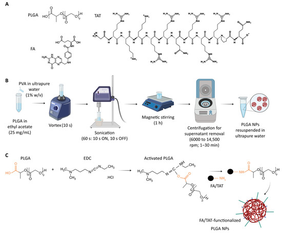 In this work, PLGA NPs were prepared using the single emulsion-solvent evaporation technique. The NPs’ surface was then functionalized with FA, TAT, or FA/TAT using the water-soluble carbodiimide coupling reagent N-(3-dimethylaminopropyl)-N′-ethylcarbodiimide hydrochloride (EDC). Figure 1 displays the chemical structure of PLGA, FA, and TAT (Figure 1A) and a schematic illustration of the PLGA NPs’ preparation (Figure 1B) and functionalization (Figure 1C).