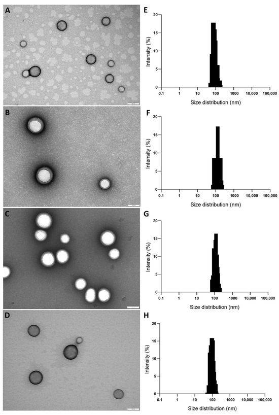 Transmission electron microscopy (TEM) images of (A) non-decorated, and (B) FA-, (C) TAT-, (D) FA/TAT-decorated PLGA NPs. Images obtained at 100,000× magnification. Scale bars represent 100 nm. Size distribution histograms of (E) non-decorated, (F) FA-, (G) TAT-, (H) FA/TAT-decorated PLGA NPs. Scales bars correspond to 100 nm.