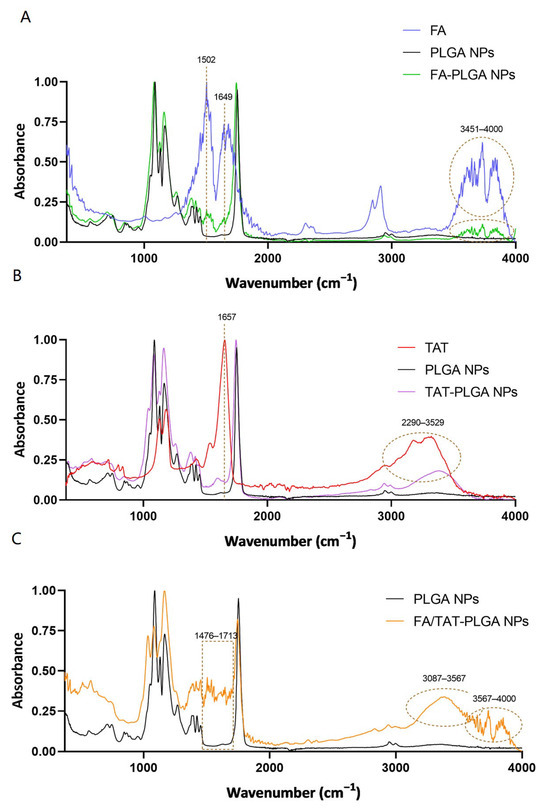 Lastly, it is possible to verify from the orange line of Figure 3C that the aforementioned characteristic bands of FA and TAT are also present in the FTIR spectrum of FA/TAT-PLGA NPs. In fact, a broad band between 1476 and 1713 cm−1, corresponding to the C-C and C=O stretches as well as the N-H bonds of both molecules, is visible. Moreover, the orange spectrum shows bands at 3087–3567 and 3567–4000 cm−1, which are bands identified in the FTIR spectra of TAT and FA, respectively.