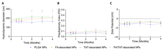 The distinct formulations’ colloidal stability, including non-functionalized and FA, TAT, and FA/TAT-functionalized PLGA NPs, was investigated over 4 months while stored at 4 °C. For that, the physicochemical properties of the NPs, including hydrodynamic diameter, PDI, and zeta potential, were evaluated as detailed in Section 3.4.1.