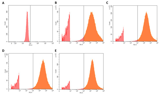 Representative images of flow cytometry results of S. aureus (orange data) (A) without treatment or treated with (B) non-modified rhodamine B-loaded PLGA NPs or (C) rhodamine B-loaded FA-modified PLGA NPs, (D) rhodamine B-loaded TAT-modified PLGA NPs, or (E) rhodamine B-loaded FA/TAT-modified PLGA NPs. The peaks to the left of the vertical central lines (red data) are related to autofluorescence of bacteria.