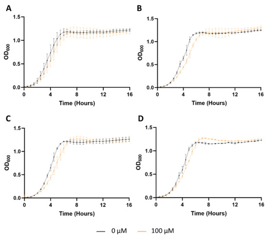Growth curves of S. aureus incubated with (A) non-modified, (B) FA-modified, (C) TAT-modified, or (D) FA/TAT-modified PLGA NPs at 0 (black) and 100 µM (orange).