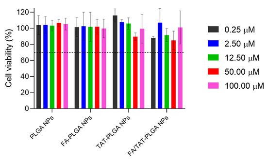 In vitro cell viability assay of non-modified, FA-, TAT-, and FA/TAT-modified PLGA NPs at increasing concentrations. The dashed line indicates the cytotoxicity threshold, representing 70% of cell viability compared to the negative control.