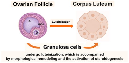 Granulosa cells (GCs) surround the oocyte (O) and are subdivided into cumulus and mural granulosa cells. The antrum (A) develops within the follicle during maturation. After ovulation, mural GCs undergo luteinization to form the corpus luteum, accompanied by profound morphological and steroidogenic changes.