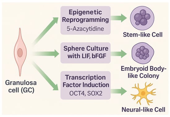 Granulosa cells represent a somatic cell population with remarkable epigenetic flexibility and the ability to adopt stem-like or lineage-specific phenotypes. Although originating from the coelomic epithelium and serving primarily reproductive and endocrine functions, GCs can be reprogrammed or transdifferentiated under controlled conditions. Experimental strategies to induce stemness include exposure to DNA methyltransferase (DNMT) inhibitors such as 5-azacytidine (5-azaC), sphere culture in the presence of growth factors (LIF, bFGF), or forced expression of transcription factors (OCT4, SOX2) (Figure 2) [,].