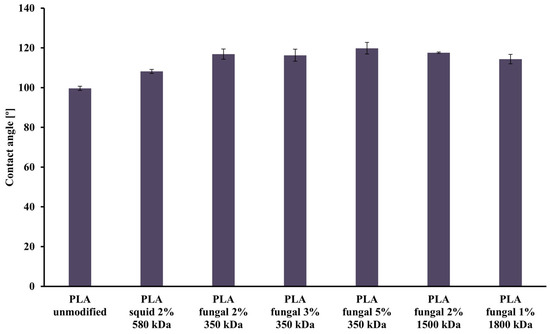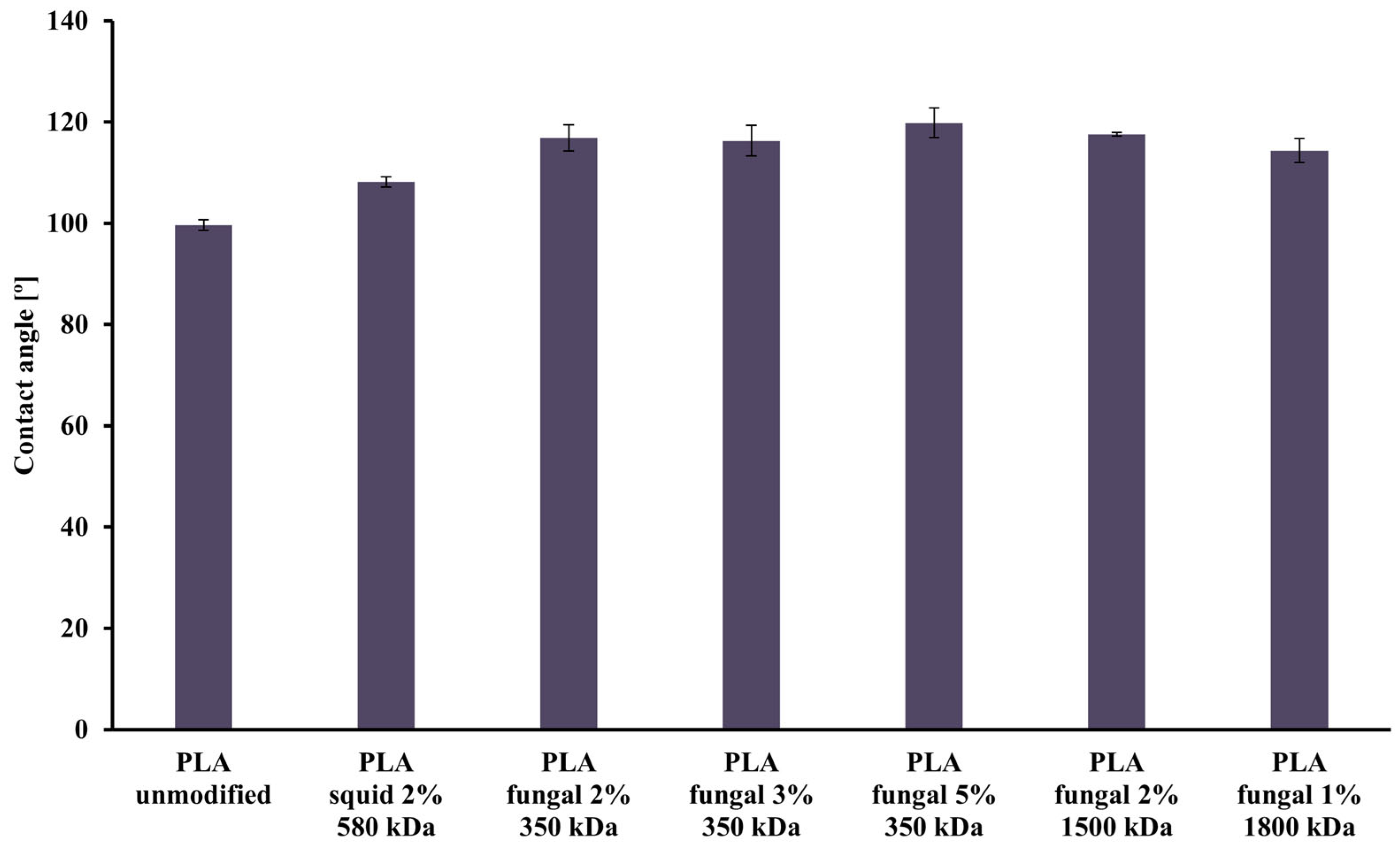 The values of the contact angle obtained for all studied PLA scaffolds are presented in Figure 4. The lowest value of contact angle (99.64°) was observed for the unmodified PLA scaffold, and the highest value (119.83°) was noticed for the PLA construct modified with 5% fungal chitosan solution characterized by 350 kDa. The differences between all materials weren’t significant, but in general, adding chitosan causes an increase in the contact angle values. Additionally, a slight increase in contact angle values was observed with increased chitosan concentration in scaffolds. However, a slight decrease in the contact angle value was noticed with the increased chitosan molecule size.