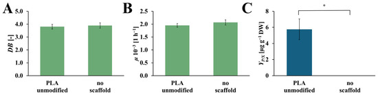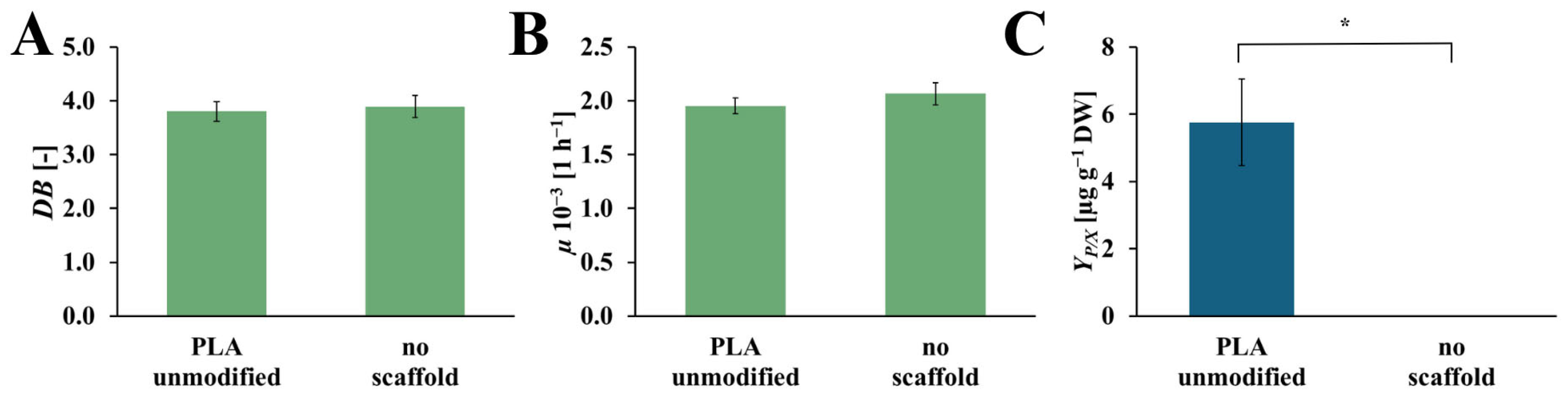 The values of dry biomass increase (DB), specific growth rate (µ), and the yield of the rinderol production (YP/X), for the culture system with and without an unmodified PLA scaffold, are presented in Figure 5. The values of DB and µ for both systems are on comparable levels. In the culture system with an unmodified PLA scaffold, DB and µ values reached 3.80 [-] and 1.95 × 10−3 [h−1], respectively, and in the culture system without a scaffold, 3.89 [-] and 2.07·× 10−3 [h−1], respectively. In the case of the YP/X values, the yield of rinderol production reached 5.76 [µg gDW−1] in the culture system with an unmodified PLA scaffold, and for the culture system without polymeric support, the rinderol concentration does not reach the detection level.