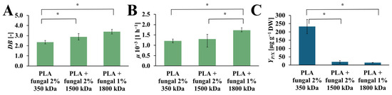 The value of DB (A), µ (B), and YP/X (C) noted after 28 days of R. graeca transgenic root cultures supported with hybrid PLA-chitosan scaffolds modified with fungal chitosan characterized by molecular mass of 350 kDa, 1500 kDa, and 1800 kDa. An ANOVA test (A,B) and Welch’s ANOVA (C) test were conducted to determine if there were significant differences between the group means. Since the result was significant, post-hoc comparisons using Tukey’s HSD test (A,B) and the Games-Howell test (C) were performed to identify which specific groups differed from one another. Statistically significant differences at the p < 0.05 level are denoted by an asterisk (*).