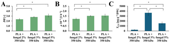 The value of DB (A), µ (B), and YP/X (C) noted after 28 days of R. graeca transgenic root cultures supported with hybrid PLA-chitosan scaffolds modified with: 2% fungal chitosan solution, 3% fungal chitosan solution, and 5% fungal chitosan solution, all equally characterized by 350 kDa. An ANOVA test (A,B) and Welch’s ANOVA (C) test were conducted to determine if there were significant differences between the group means. Since the result was significant, post-hoc comparisons using Tukey’s HSD test (A,B) and the Games-Howell test (C) were performed to identify which specific groups differed from one another. Statistically significant differences at the p < 0.05 level are denoted by an asterisk (*).