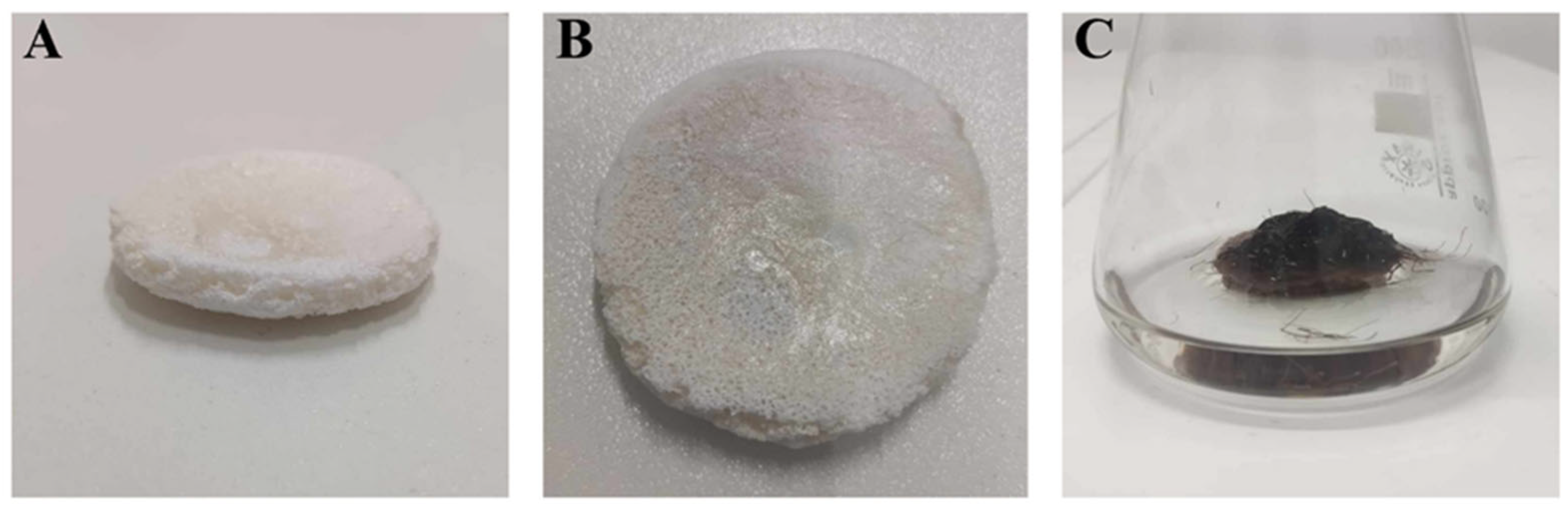 The shape of the PLA constructs used in this study is presented in Figure 1A,B. All constructs were prepared as flat cylindrical platforms with a 4 cm diameter and ca. 0.5–0.7 cm height, which provided a solid surface for R. graeca hairy root adherence. After inoculation, the PLA scaffolds lift transgenic root biomass over the surface of the medium, as shown in Figure 1C. It protects the fragile biomass of hairy roots from mechanical and hydrodynamic stress and enhances the accessibility of oxygen for cultured biomass.