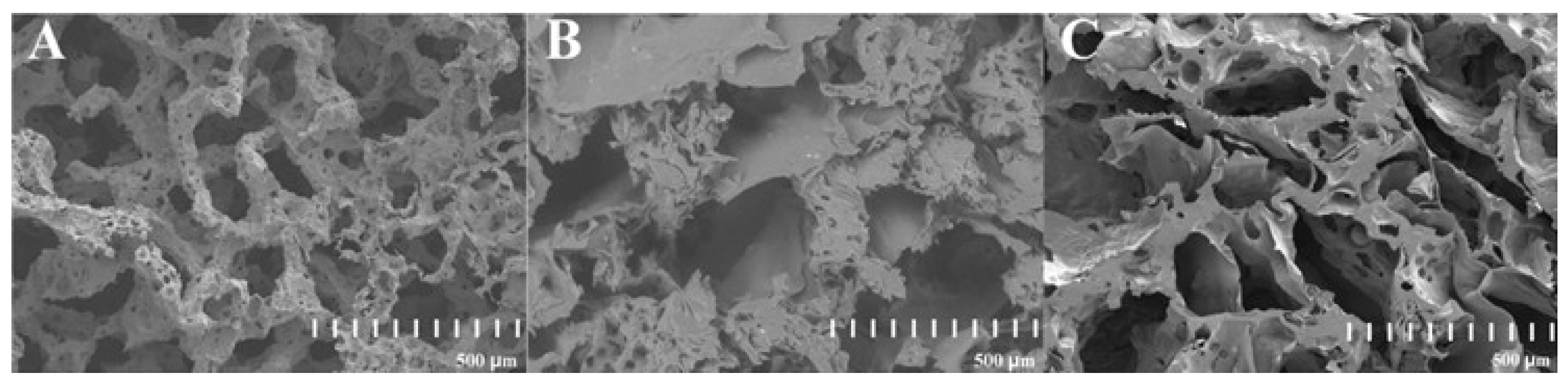 The SEM images of three PLA constructs contain: (i) unmodified PLA, (ii) PLA modified with fungal chitosan, and (iii) PLA modified with squid chitosan are presented in Figure 2. The internal structure of all scaffolds used in the study was highly developed. There were many pores with irregular shapes and sizes (from around 200 µm to around 3000 µm). The medium size of the walls varies from 200 µm to 1000 µm, and on each of them occur small cavities, which increase the total surface of the material. The surface of the constructs modified with chitosan (Figure 2B,C) was sharper than in the unmodified PLA scaffold (Figure 2A).