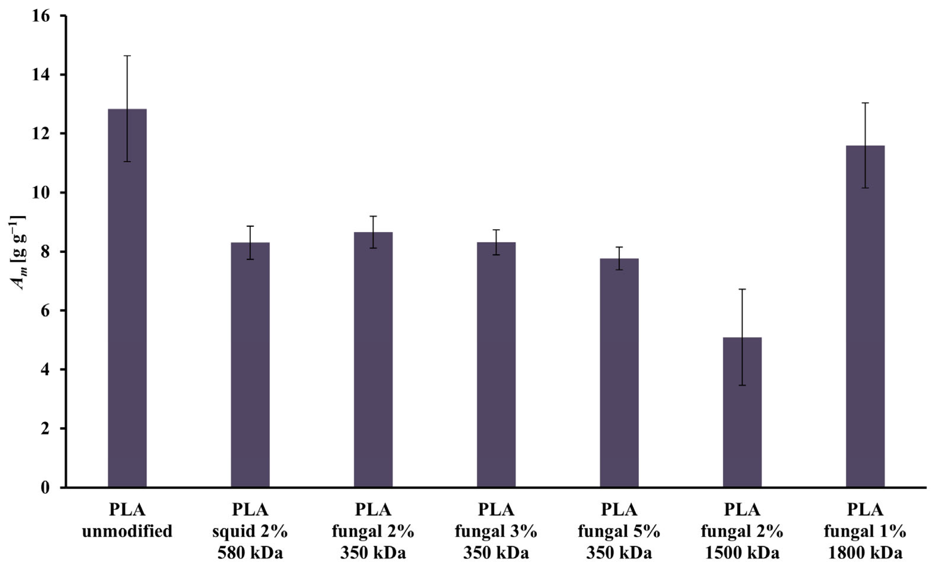 Values of Am characterizing all scaffolds (i.e., reference unmodified PLA, and hybrid PLA-chitosan scaffolds, varied in chitosan source, concentration, and molecular mass) used for this study.