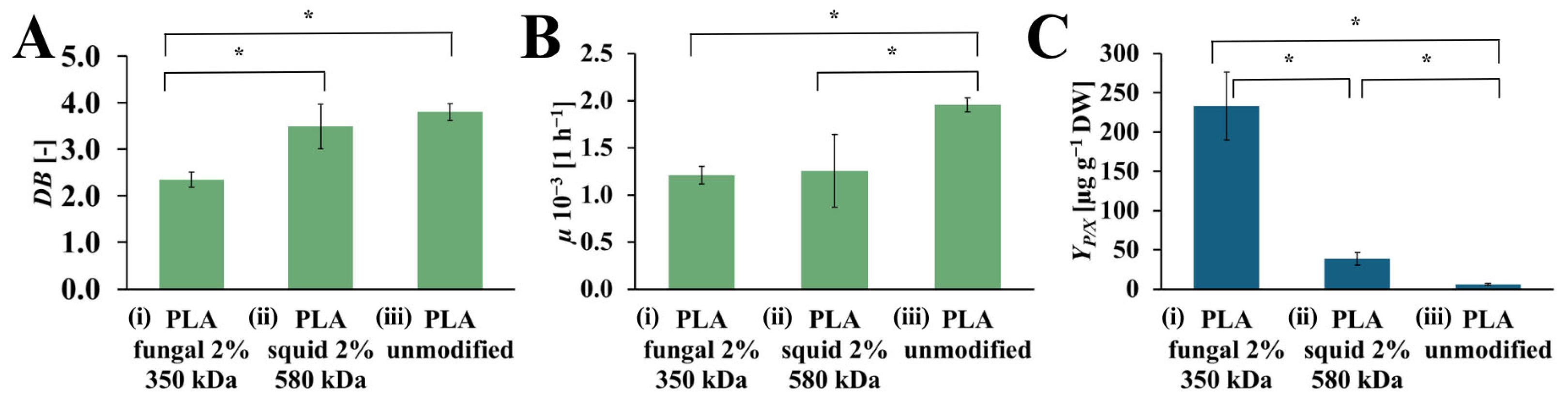 The DB, µ, and YP/X values obtained for cultures that contain PLA scaffolds with different molecular mass fungal chitosan are presented in Figure 7. The increase in DB values was observed with the increase in molecular mas of the chitosan, which was used for surface modification of the PLA scaffold. The highest value was obtained for the culture with PLA scaffold modified with 1800 kDa fungal chitosan (DB = 3.38 [-]). Noticeably lower value was observed for the PLA scaffolds modified with the 1500 kDa fungal chitosan (DB = 2.88 [-]). The lowest DB value was observed in the culture system that contained PLA scaffolds modified with 350 kDa fungal chitosan (DB = 2.35 [-]). The µ values also increased with the chitosan molecular mass applied to modify the PLA scaffold. The highest value of µ was obtained in the culture with PLA scaffold modified with 1800 kDa fungal chitosan (µ = 1.72·× 10−3 [h−1]). A noticeably lower µ value was observed for the culture systems containing PLA scaffold modified with 1500 kDa and with 350 kDa fungal chitosan (µ = 1.30·× 10−3 [h−1], and µ = 1.20·× 10−3 [h−1], respectively). However, the highest YP/X value was obtained for the culture system containing PLA scaffold modified with 350 kDa fungal chitosan (YP/X = 232.56 [µg gDW−1]). Significantly lower values, about 12 and 16 times lower, were observed for the cultures supported by PLA scaffold modified with 1500 kDa and with 1800 kDa fungal chitosan (YP/X = 19.38 [µg gDW−1], and YP/X = 14.63 [µg gDW−1], respectively).