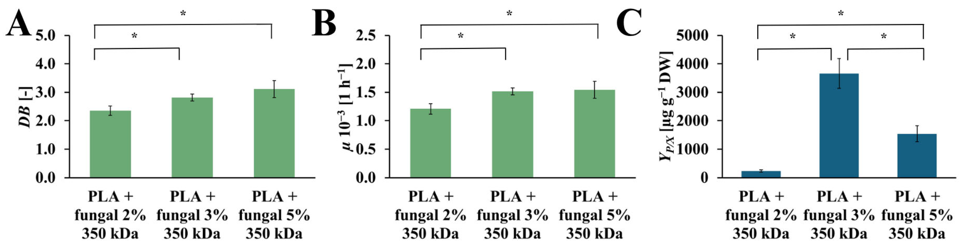 The values of the DB, µ, and YP/X obtained in cultures containing PLA scaffolds modified with 2%, 3%, and 5% concentrations of the fungal chitosan solution are presented in Figure 8. The DB values increase with the increased chitosan concentration in the modified PLA scaffolds. In the cultures with the PLA scaffolds modified with 2%, 3%, and 5% fungal chitosan solution, the following values of DB were observed: 2.35 [-], 2.82 [-], 3.11 [-], respectively. The highest value of µ was observed in the culture system containing PLA scaffolds modified with 5% chitosan solution (µ = 1.54·× 10−3 [h−1]). A similar value of µ was noticed for the culture system with PLA scaffolds modified with 3% chitosan solution (µ = 1.52·× 10−3 [h−1]). A slightly lower µ value was observed for the culture system containing PLA scaffolds modified with 2% chitosan solution (µ = 1.21·× 10−3 [h−1]). Similarly to the DB value, the highest µ value was obtained in the culture system with PLA scaffolds modified with 5% chitosan solution. Still, it is not significantly higher than the µ value for the culture system with PLA scaffolds modified with 3% chitosan solution. The YP/X reached the highest value for the culture system containing PLA scaffolds modified with 3% chitosan solution (YP/X = 3660.47 [µg gDW−1]). The value of this parameter obtained for the other cultures was noticeably lower. For the culture system with PLA scaffolds modified with 5% chitosan solution, the YP/X value was around 2.5 times lower than the YP/X value observed for the best culture system (YP/X = 1543.52 [µg gDW−1]). In the case of the culture system containing PLA scaffolds modified with 2% chitosan solution, the YP/X value was around 16 times lower than the highest YP/X value noticed in this study (YP/X = 232.56 [µg gDW−1]).