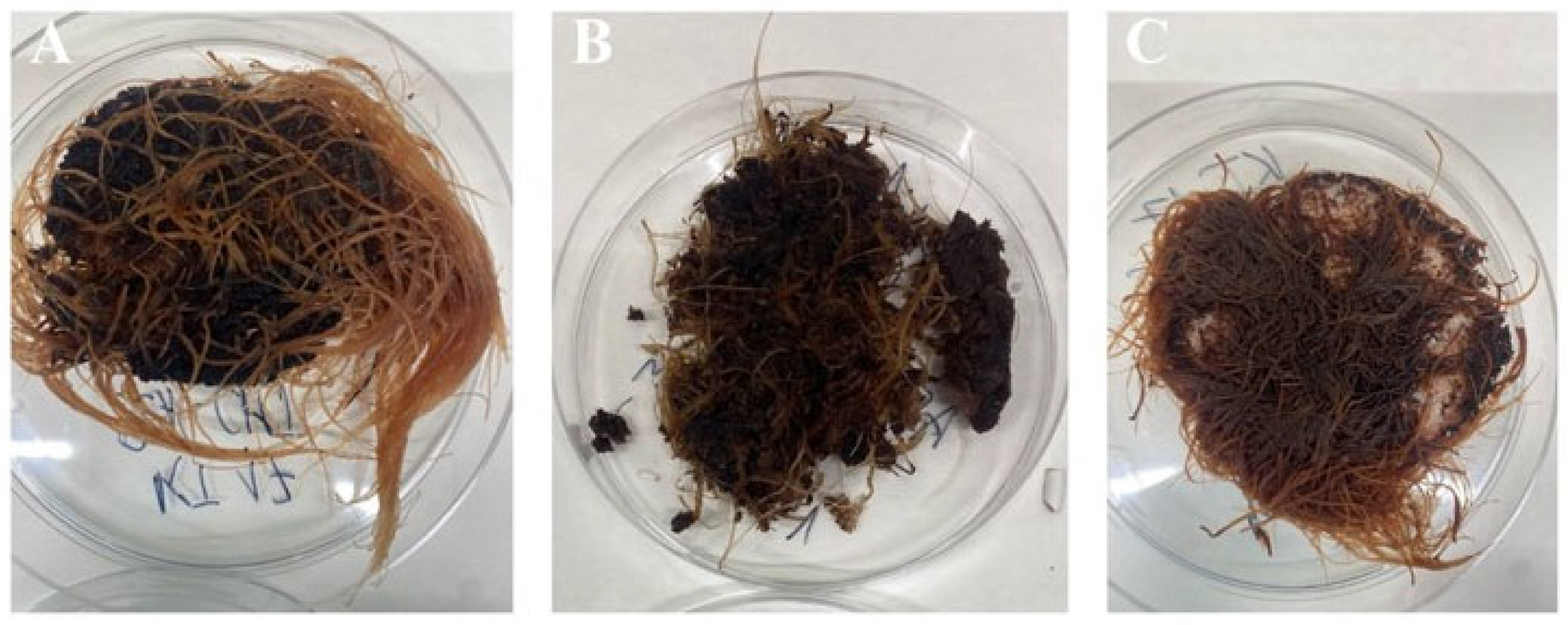 Examples of the R. graeca transgenic roots harvested after 28-day cultures supported with hybrid PLA-chitosan scaffolds modified with 2% fungal chitosan, characterized by 350 kDa (A), with hybrid PLA-chitosan scaffolds modified with 3% fungal chitosan, characterized by 350 kDa (B), and from the reference culture system supported with an unmodified PLA scaffold (C).