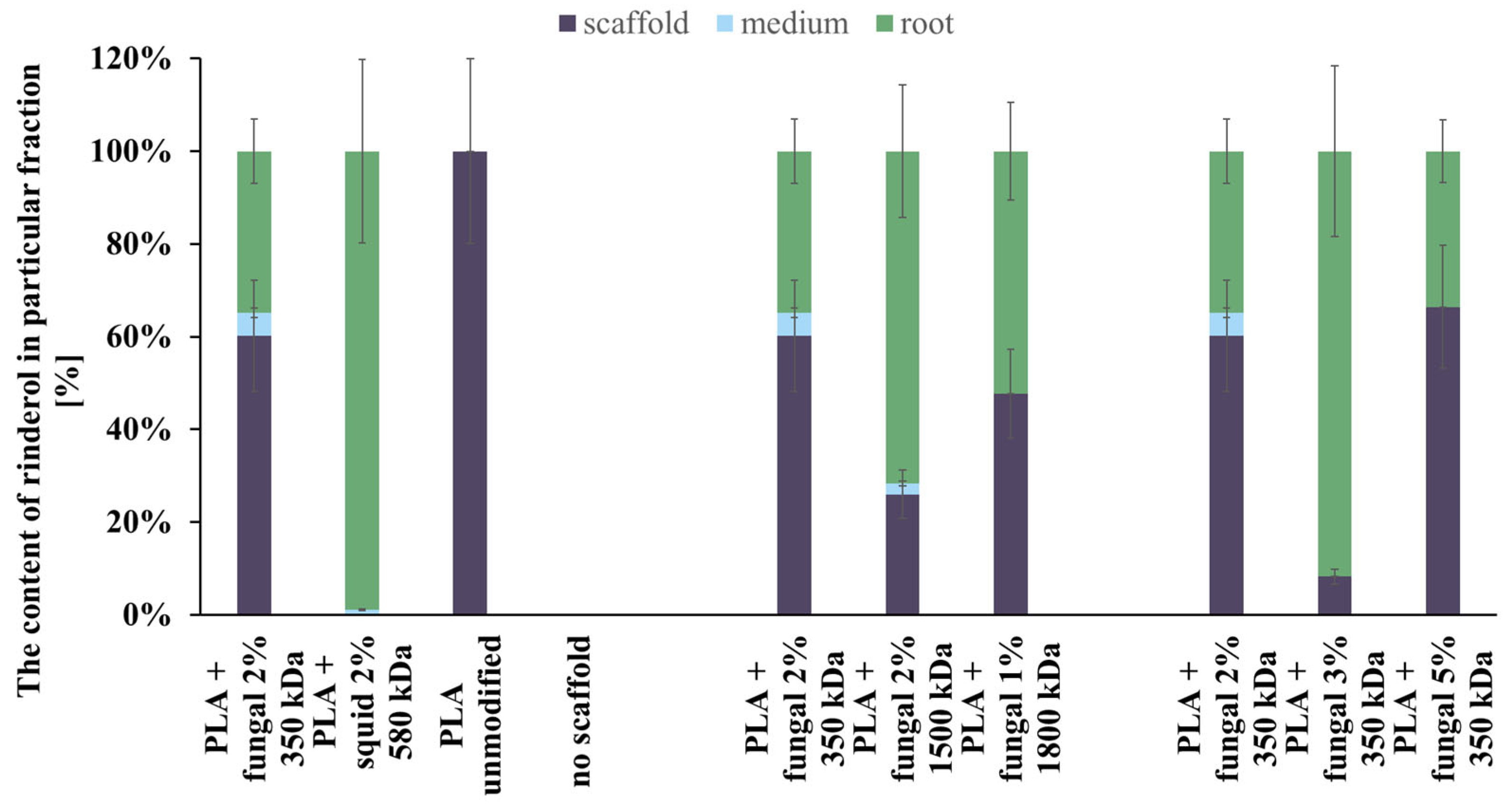 The content of rinderol in a particular fraction of each culture system is presented in Figure 10. In almost every culture system, the amount of rinderol found in the scaffold fraction was significantly higher than in the culture medium. The exception was the culture system containing PLA scaffold modified with squid chitosan, but the mass of the obtained rinderol was very low. As we can see, the polymeric scaffold sorbed it effectively when the R. graeca hairy roots secreted the rinderol into the culture medium. The contents of rinderol in scaffold and root fractions in all tested PLA-chitosan scaffolds varied due to the difficulties in separating hairy roots from the scaffolds. Small parts of the scaffold attached to the roots were extracted with the root fraction, which probably increased the content of rinderol in the root fraction.