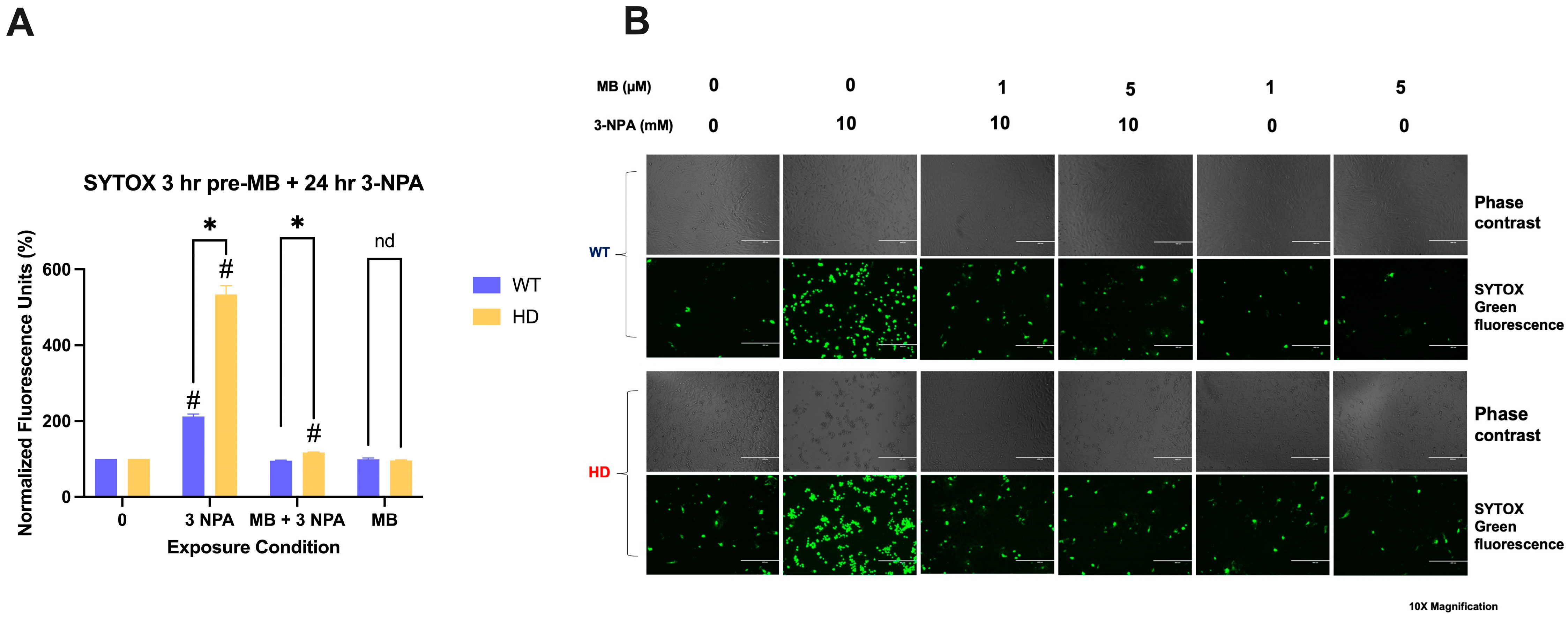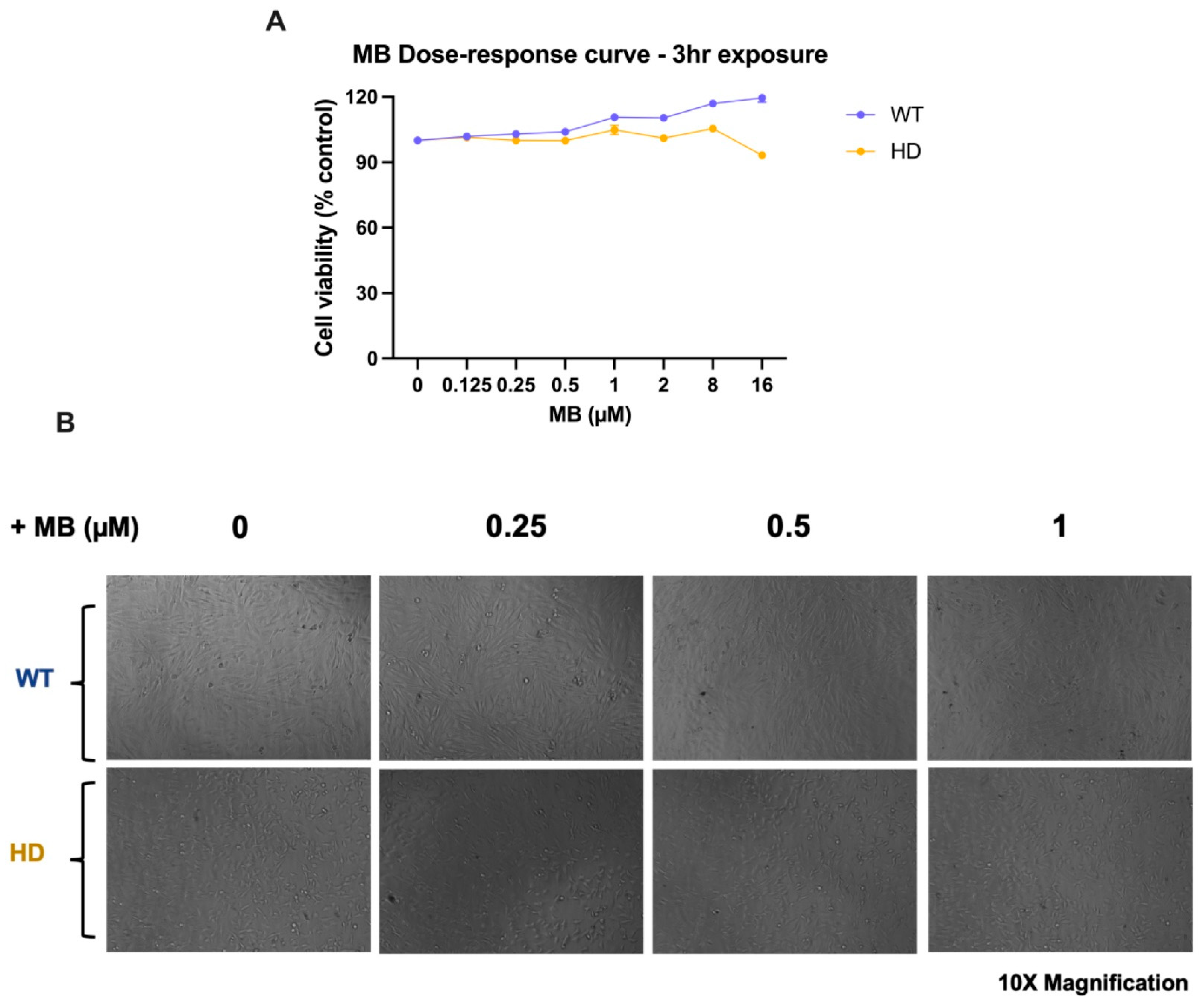 Hale, H.K.; Elias, K.M.; Ho, S.; Kwakye, G.F. Methylene Blue Attenuates 3-Nitropropionic Acid-Induced Oxidative Stress and Mitochondrial Dysfunction in Striatal Cells: Therapeutic Implications in Huntington’s Disease Neuropathology. Int. J. Mol. Sci. 2025, 26, 10672. https://doi.org/10.3390/ijms262110672