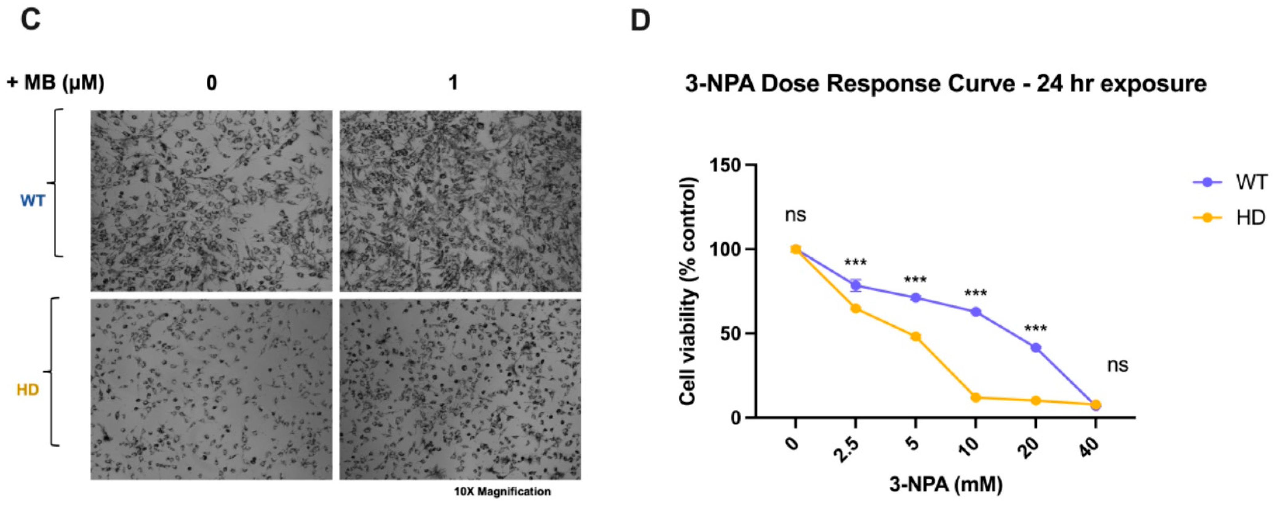 APA StyleHale, H. K., Elias, K. M., Ho, S., & Kwakye, G. F. (2025). Methylene Blue Attenuates 3-Nitropropionic Acid-Induced Oxidative Stress and Mitochondrial Dysfunction in Striatal Cells: Therapeutic Implications in Huntington’s Disease Neuropathology. International Journal of Molecular Sciences, 26(21), 10672. https://doi.org/10.3390/ijms262110672