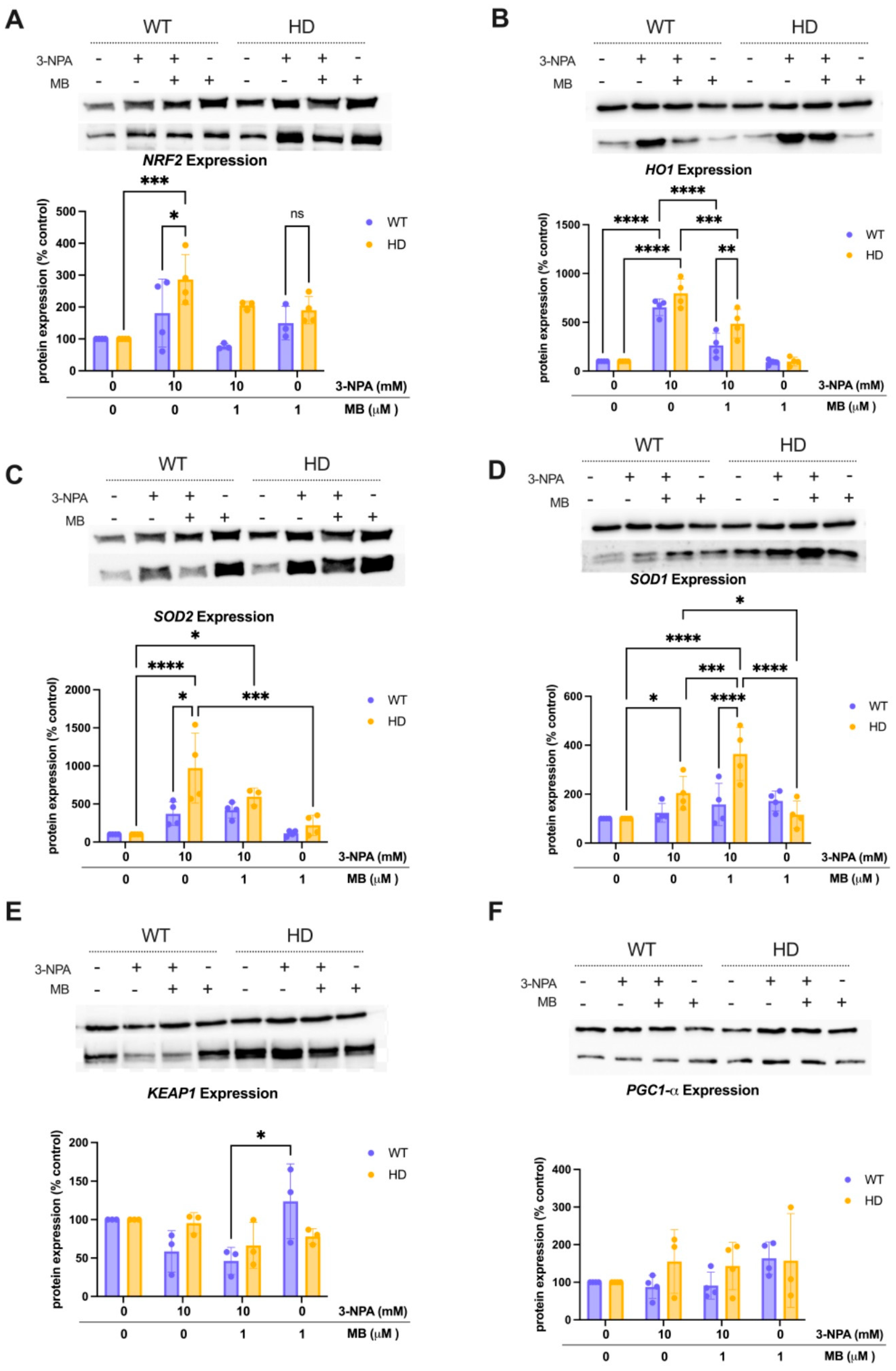 2.4. MB Alters 3-Npa-Induced Changes in Oxidative Stress-Related Proteins in Wt and HD Cells