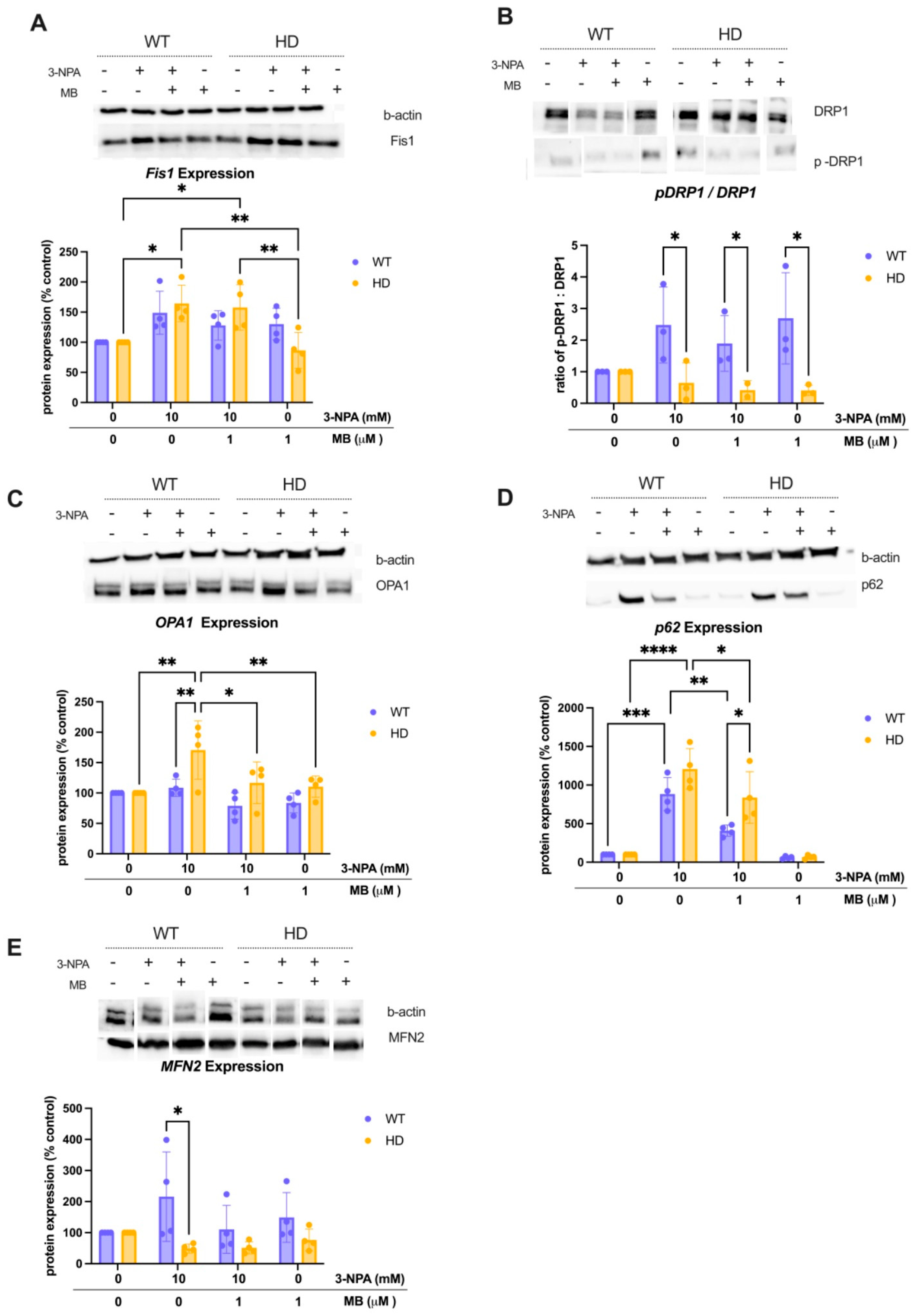 2.5. MB Alters the 3-Npa-Induced Changes in the Expression of Proteins Involved in Regulating Mitochondrial Dynamics