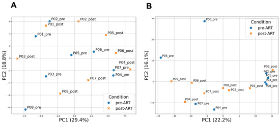 Principal component analysis (PCA) was performed on the 250 most variable genes, selected after filtering out low-abundance features (CPM ≥ 1 in ≥3 samples) and log2 transformation. When retaining the top 250 most variable genes, the first two principal components (PC1 and PC2) explained 29.4% and 18.8% of the total variance, respectively, and revealed a partial separation of samples according to ART status (Figure 1A). PCA including all expressed genes explained a smaller proportion of variance (22.2% and 16.1% for PC1 and PC2, respectively) but produced clearer clustering of pre- and post-ART samples (Figure 1B). The third component (PC3) accounted for an additional 12.0% of the variance, and the PC1 versus PC3 projection is shown in Supplementary Figure S1.