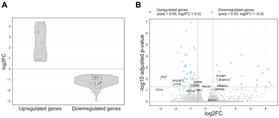 Figure 2A displays the distribution of log2FC among the differentially expressed genes. Upregulated genes exhibited a broader range of log2FC values, while downregulated genes showed a more concentrated distribution, with most genes demonstrating moderate decreases in expression levels.