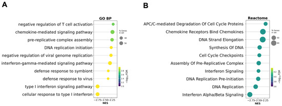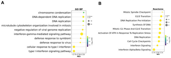 Compared to the original analysis, interferon-related and cell cycle–associated pathways remained among the most significantly downregulated, but their relative enrichment scores and ranks changed. GO biological processes such as ‘type I interferon signaling pathway’ and ‘defense response to virus’ remained enriched, while some DNA replication and mitosis-related terms became more prominent. In the Reactome analysis, ‘Interferon Alpha/Beta Signaling’ and ‘DNA Replication’ also remained among the top suppressed pathways, but additional cell cycle checkpoints and APC/C-related modules became more significant.