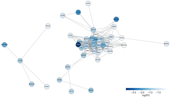 Protein–protein interaction network of downregulated genes after ART. Each node represents a protein encoded by a downregulated gene, and edges denote high-confidence interactions. Node color indicates the magnitude of gene downregulation, represented as log2FC between pre- and post-ART samples: darker blue corresponds to stronger suppression.